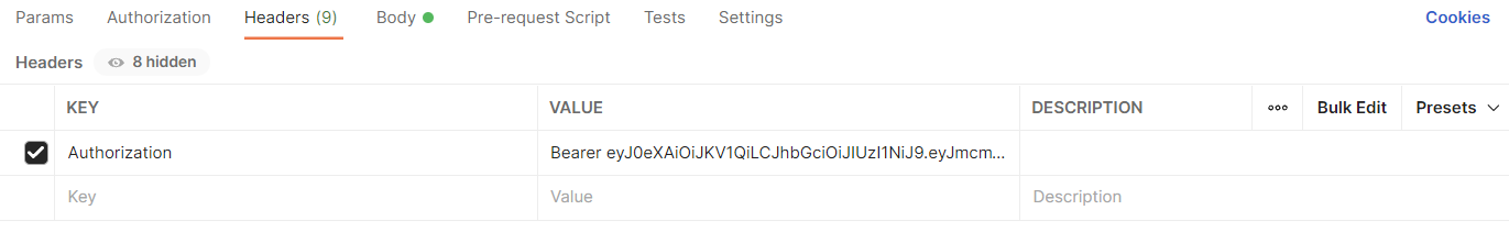 # Value에는 Bearer를 입력하고 한칸 뛰어서 access_token을 입력한다.