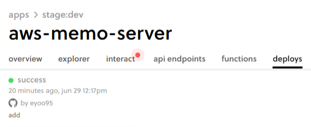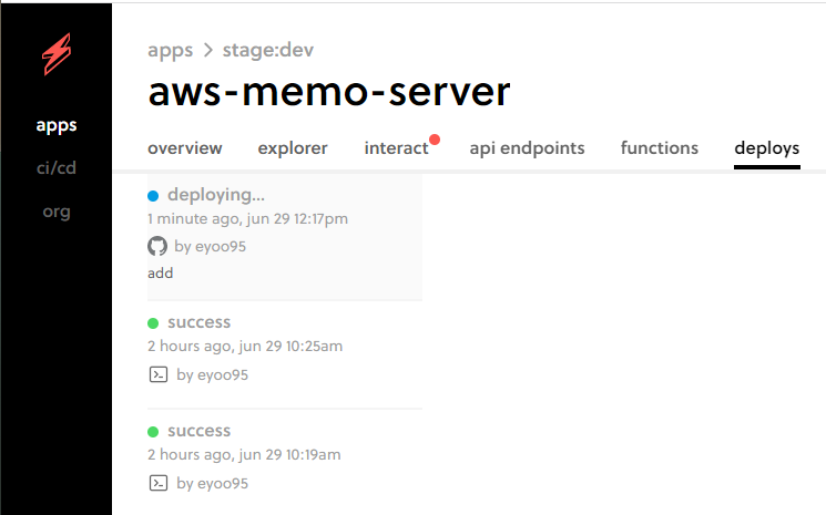 그러면 serverless의 해당 앱의 대시보드 중 deploy에서 deploying 상태인것을 확인할수있다.