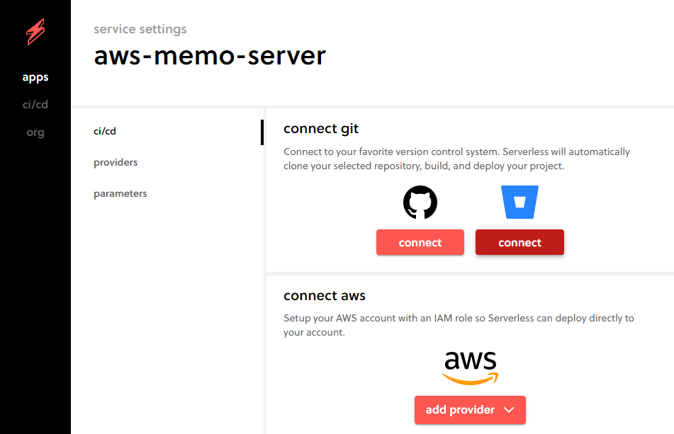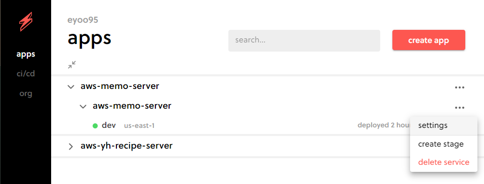 serverless 에서 해당 app의 메뉴를 눌러 settings를 선택한다.