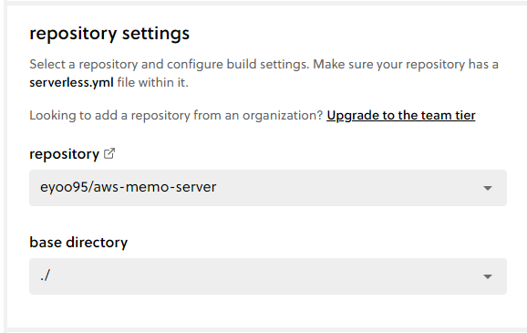 그 밑의 repository settings에서 해당 레파지토리를 선택하여 연결한다.