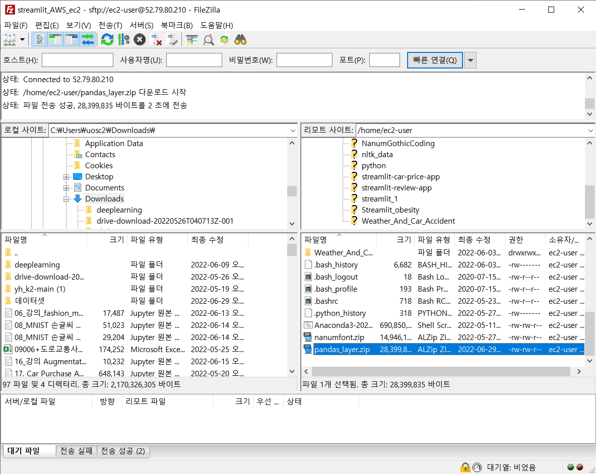 ec2에 저장되어 있는 pandas-layer.zip을 파일질라로 로컬에 다운로드한다.