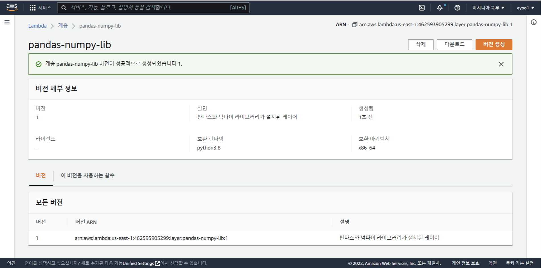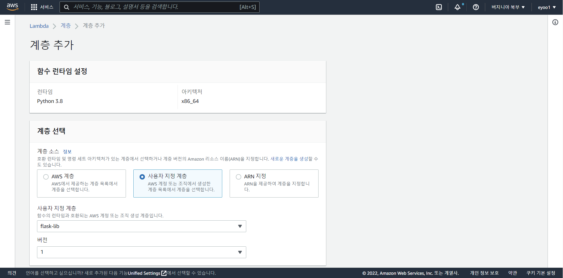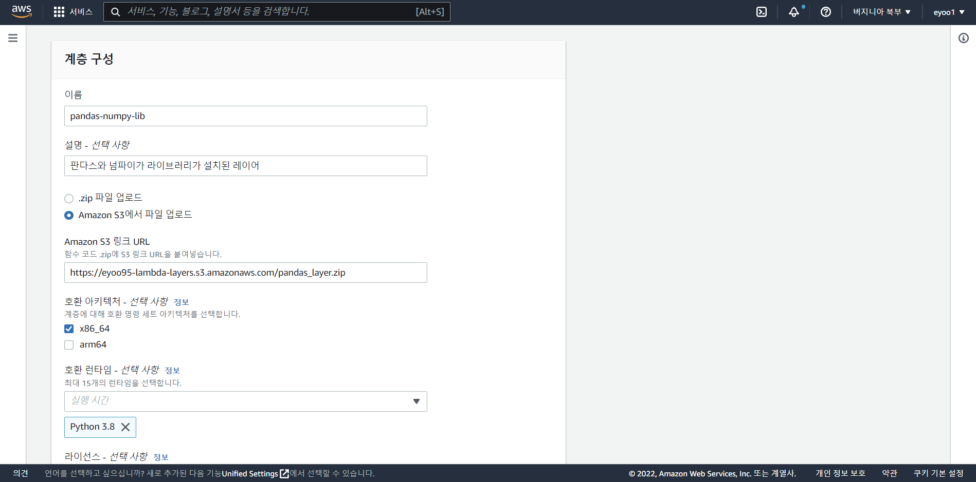 # 호환 아키텍쳐는 x86_64를 선택하고 호환 런타임은 파이썬 3.8을 선택한다.