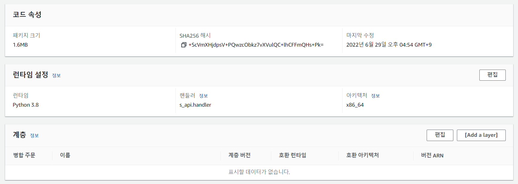 AWS Lambda 에서 함수 페이지 하단에 계층이 있는데 [Add a layer]를 클릭하여 레이어를 적용할수있다,
