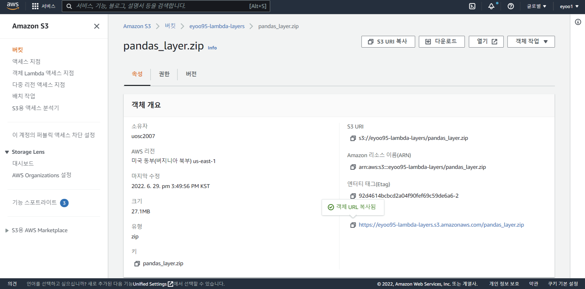 pandas-layer.zip 을 버킷에 업로드 한 뒤 객체 URL을 복사한다.