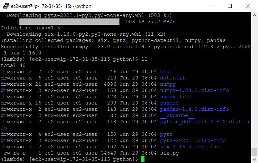 아마존 리눅스의 넘파이와 판다스를 다운로드 한다.