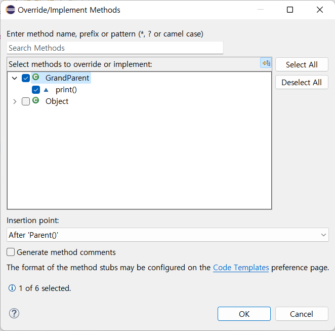 메소드 오버라이딩을 하기위해 printParentInfo와 printChildInfo 둘다 print로 바꿔준다.