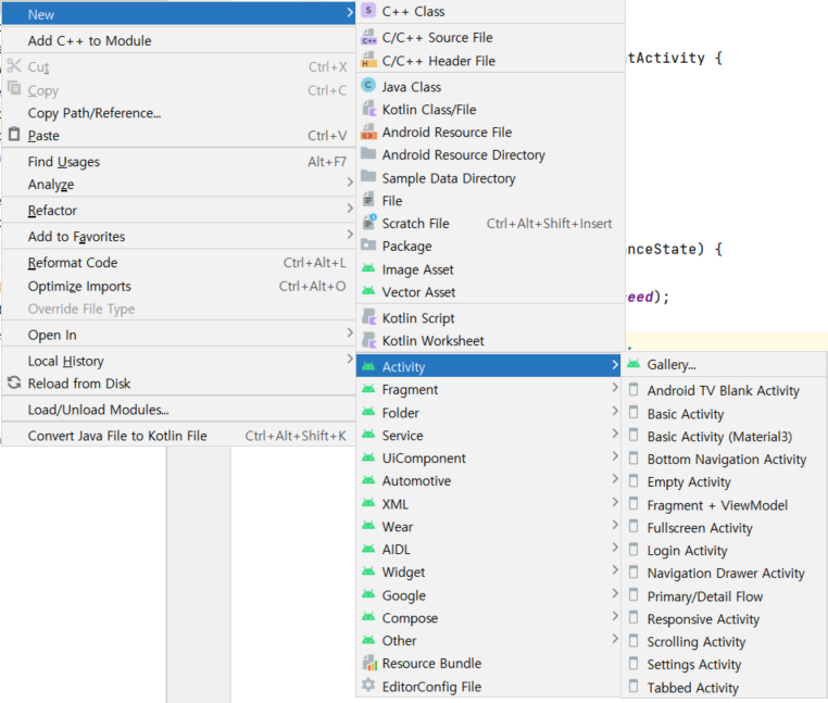 엑티비티를 만들면 res의 layout에 해당 엑티비티의 레이아웃도 만들어진다.