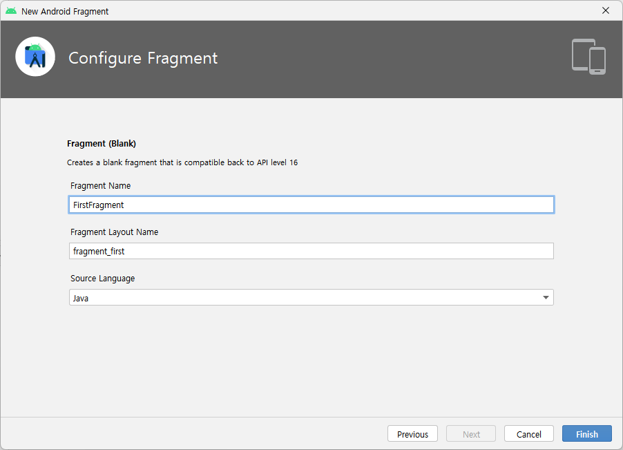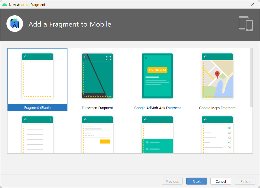 위의 New Destination 버튼을 누른 후 Create new destination을 선택해 fragment들을 추가한다.