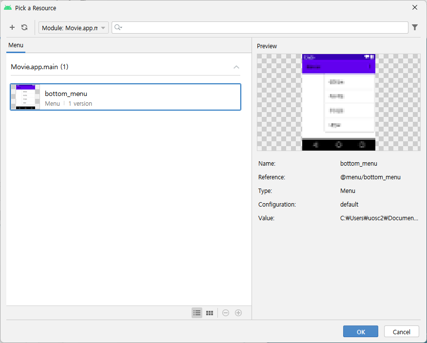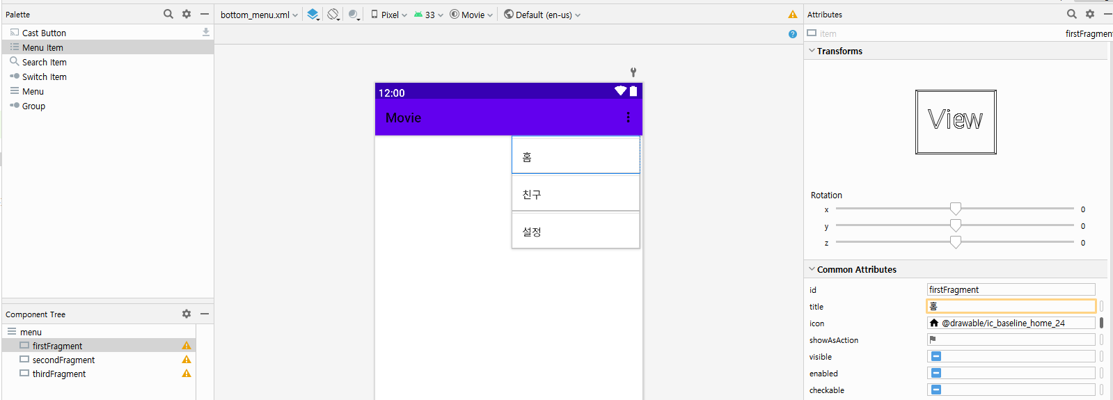 위에서 만든 메뉴를 메인 레이아웃의 bottomNavigationView에서 menu로 적용시킨다.