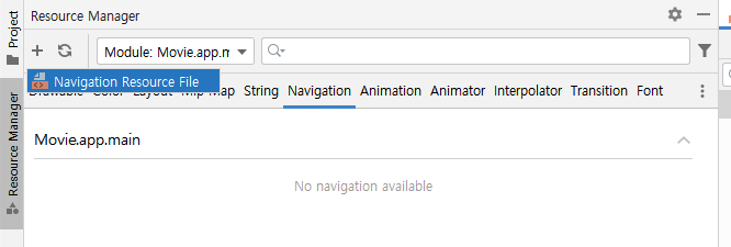 왼쪽의 Resource Manager를 열고 Navigation을 선택 후 추가버튼을 누른다.