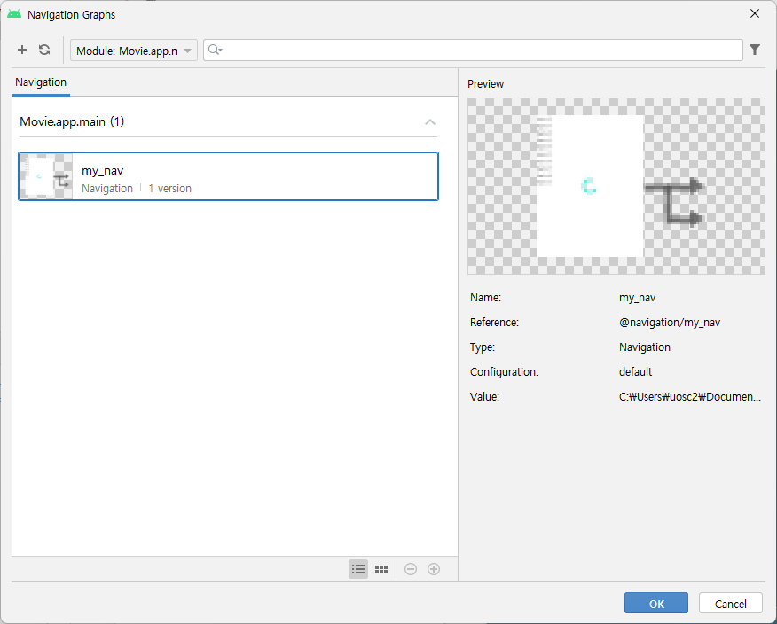 그러면 아래와 같은 창이 나오는데 위에서 만들었던 my_nav를 선택하여 넣는다.