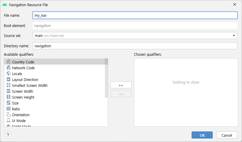 # 그럼 Navigation Resource File이 나오는데 그것을 눌러 생성한다.