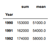df.groupby('Year')['Salary'].agg([np.sum, np.mean])