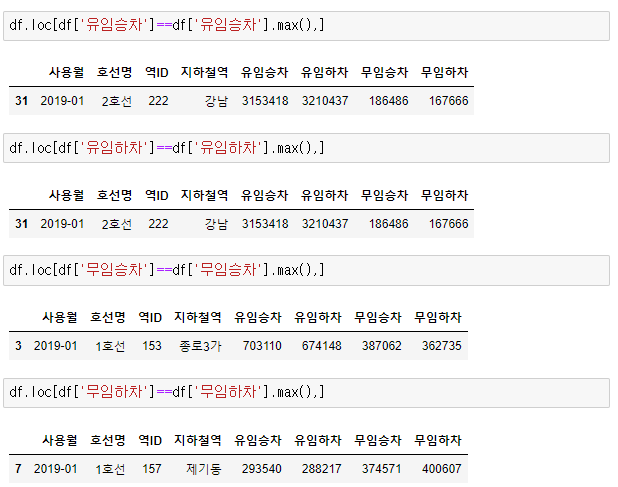실습 0. 유임승차, 유임하차, 무임승차, 무임하차 4가지 별로, 각각 가장 많은 역을 찾아보세요.