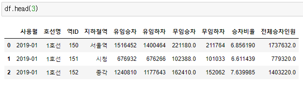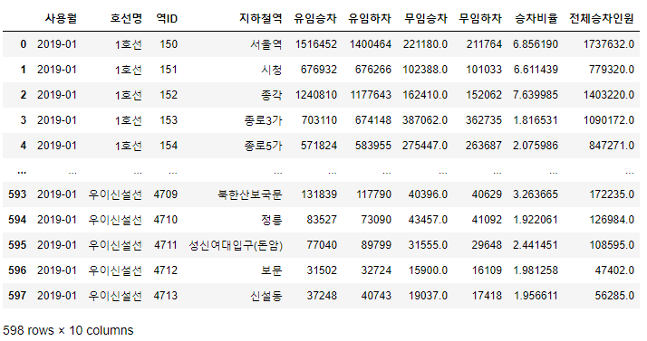 먼저 첫번째와 두번쨰 행에 있는 서울역과 시청의 승하차현황을 나타내보면서 어떻게 코드를 짜야할지 생각하자.