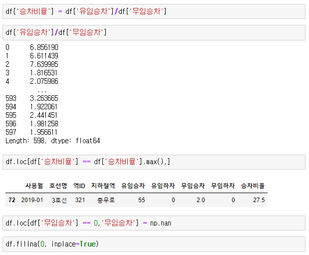 # 무임승차 컬럼에 0값을 가진 데이터가 있어 그대로 나누어주면 inf나온다