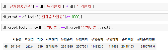 실습 1. 무임승차 대비 유임승차 비율이 가장 높은 역은 어디입니까?
