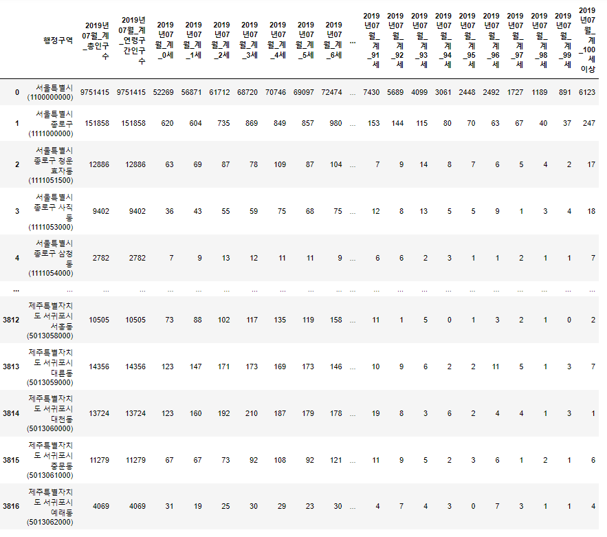 # '행정구역' 컬럼에는 구단위 밑에 동단위로 나열되어있는것에 유의하자