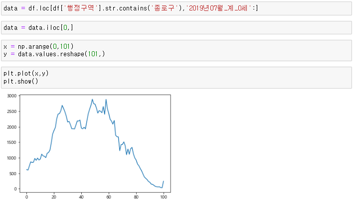 실습 2. '종로구' 의 인구 구조를, 0세부터 100세 까지 나이대 별로 몇명이 있는지 시각화 하세요.