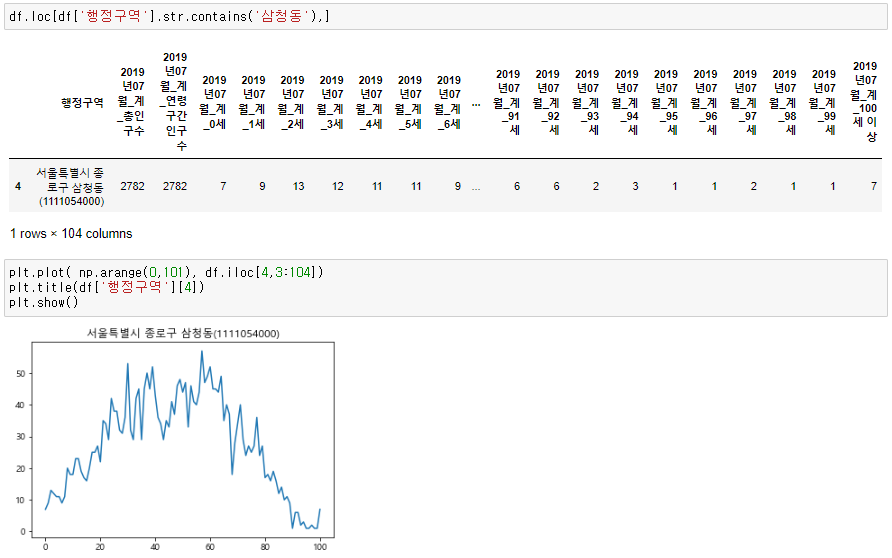 실습 1. '삼청동' 의 인구 구조를, 0세부터 100세 까지 나이대 별로 몇명이 있는지 시각화 하세요. (가로축은 나이, 세로축은 인구수)