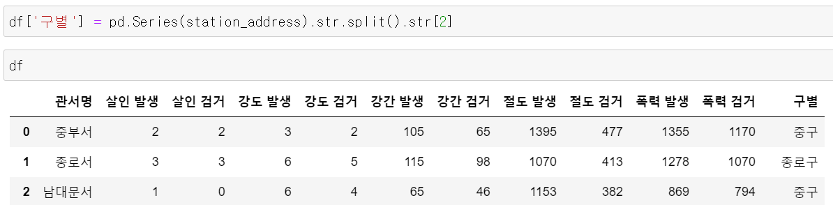 따로 띄어낸 구를, crime_anal_police 에 '구별' 컬럼을 만들어서 넣습니다.