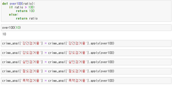 실습 7. describe() 함수로 값을 확인해 보니, 검거율이 100 이상인 경우도 있다. 따라서 100보다 크면, 100으로 값을 셋팅하세요.