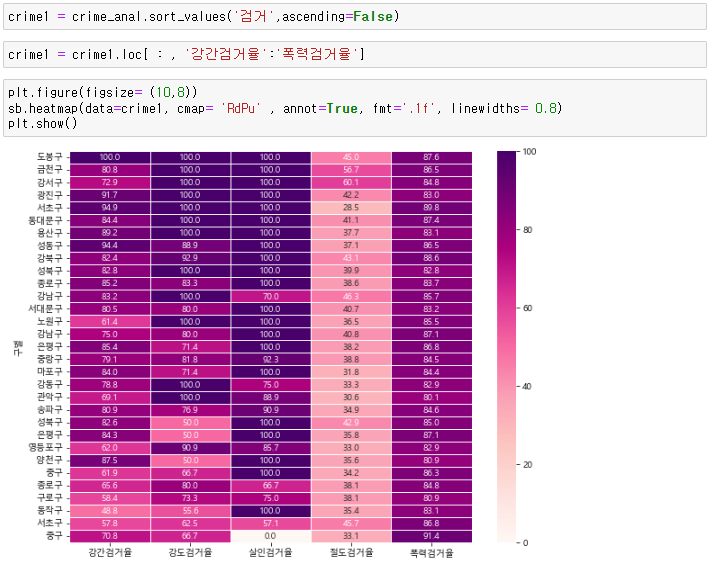 실습 18. sb.heatmap 을 이용해서 '강간검거율', '강도검거율', '살인검거율', '절도검거율', '폭력검거율' 을 보여주세요. 단, '검거' 로 정렬한 데이터로 보여주세요.