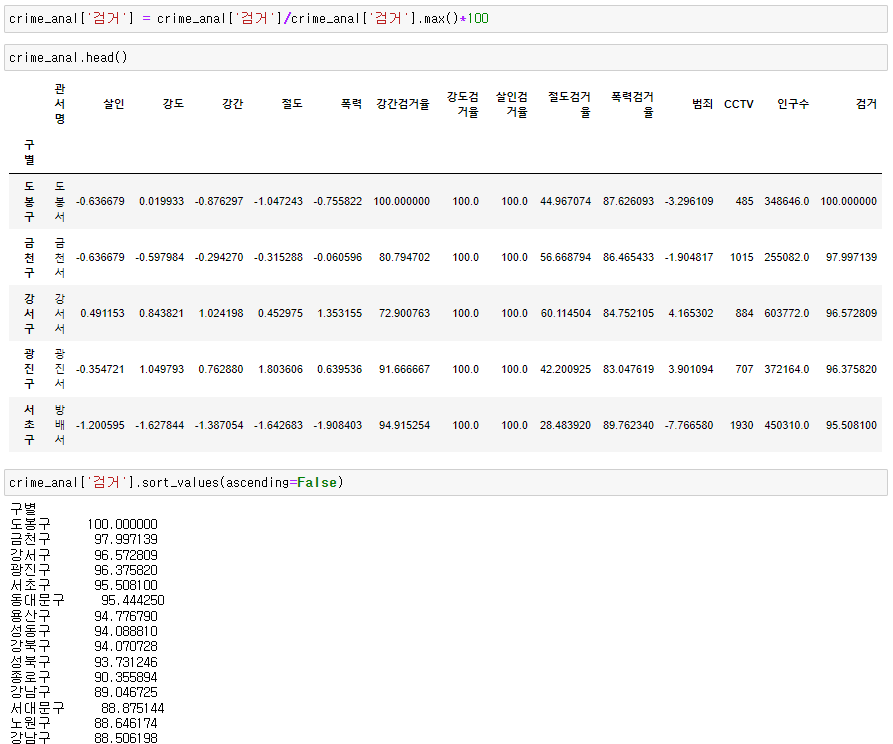 실습 17. 검거가 가장 큰값이 432.593167 입니다. 검거의 값이 최대가 100이 되도록 정규화를 하세요. 그리고 검거값으로 정렬하세요.