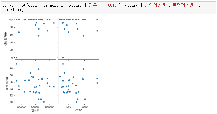 실습 14. x_vars는 "인구수", "CCTV" 를, y_vars는 "살인검거율", "폭력검거율"로 pariplot을 나타내고, 연관성을 확인하세요.