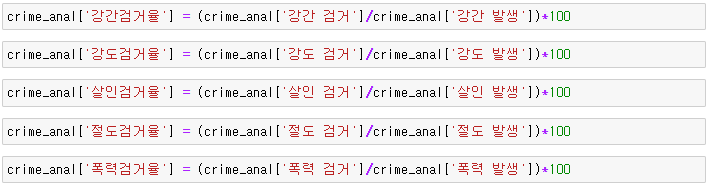 실습 5. '강간검거율' , '강도검거율', '살인검거율', '절도검거율', '폭력검거율' 을 계산하여, crime_anal에 각 컬럼을 추가한다. ( 검거율은 * 100 까지 한 값)