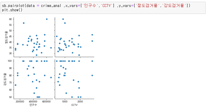 실습 15. x_vars는 "인구수", "CCTV" 를, y_vars는 "절도검거율", "강도검거율"로 pariplot을 나타내고, 연관성을 확인하세요.