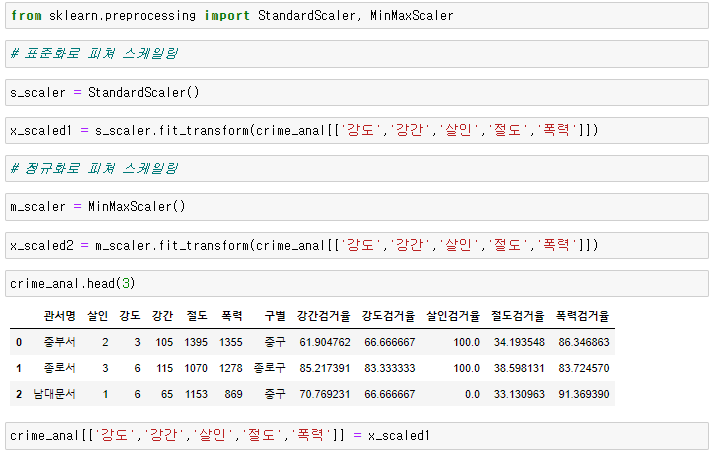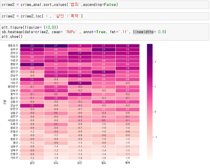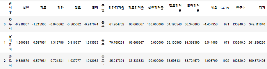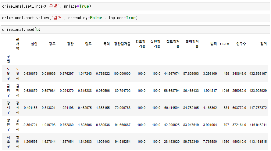 crime_anal['범죄'] = crime_anal['강도']+crime_anal['강간']+crime_anal['살인']+crime_anal['절도']+crime_anal['폭력']