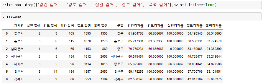 실습 6. 이제 필요없는, '강간 검거' , '강도 검거', '살인 검거', '절도 검거', '폭력 검거' 컬럼을 제거한다.