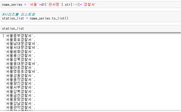 관서명 컬럼에 있는 값들을 가져와서 왼쪽에는 서울, 오른쪽에는 경찰서라고 붙인다.