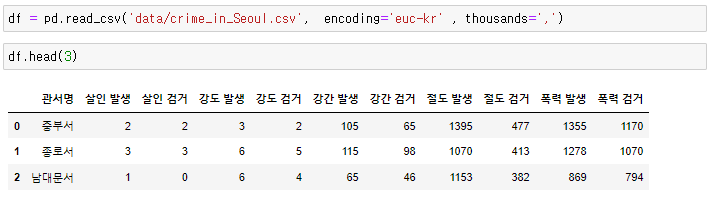 실습 1. crime_in_Seoul.csv 파일을 pandas 로 읽어오세요.