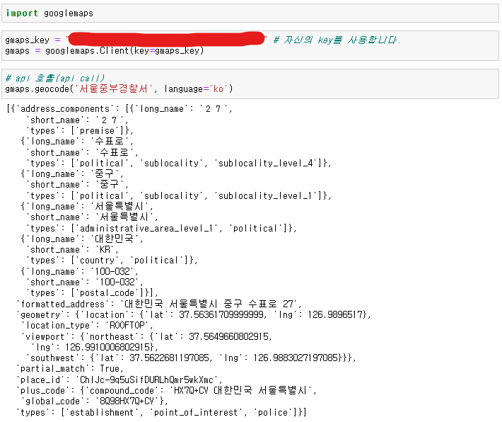 구글 맵 API 를 이용해서, 경찰서가 무슨 구에 있는지 확인하기 위해 아나콘다 프롬프트웨어 다음을 실행. (pip install googlemaps)