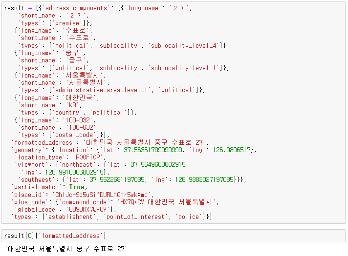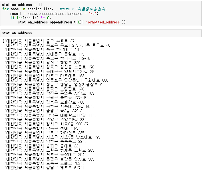 station_names 리스트에 있는 경찰서 명칭을 구글맵api에 넣어서 호출한다.