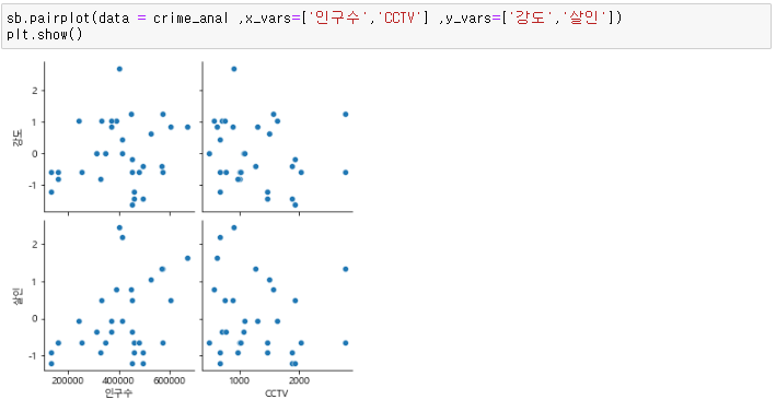 실습 13. x_vars는 "인구수", "CCTV" 를, y_vars는 "살인", "강도"로 pariplot을 나타내고, 연관성을 확인하세요.