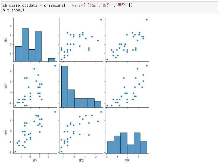 실습 12. sb의 pairplot 으로 "강도", "살인", "폭력" 을 나타내세요. (연관성 확인)
