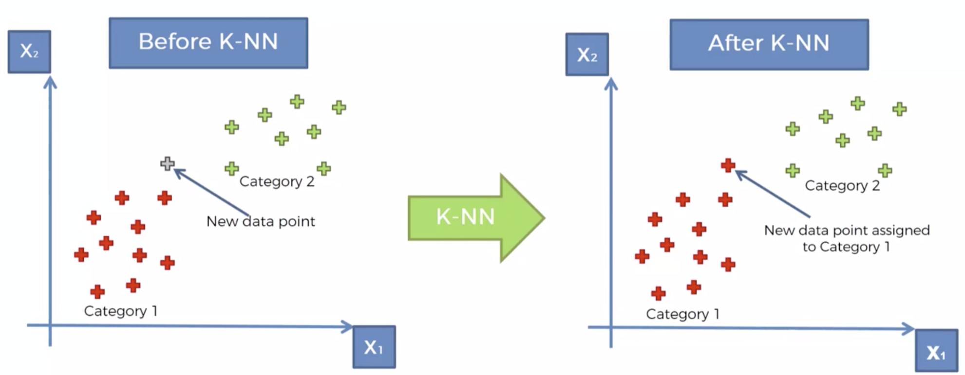 # K 개의 이웃 카테고리를 확인한 후, 카테고리의 숫자가 많은 쪽으로 새로운 데이터의 카테고리를 정한다.