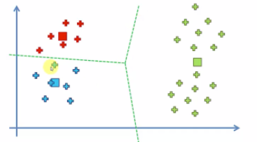 kmeans 클러스터링은 랜덤한곳에 점 두개를 찍어 점사이를 기준으로 수직이등분하여 영역을 나눈다. (클러스터링)