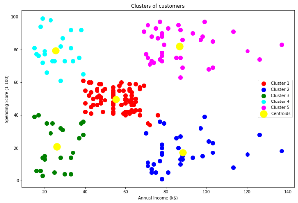 Kmeans를 그룹개수 5개로 설정하여 모델링한다.