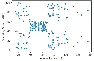 sb.scatterplot(data= df, x = 'Annual Income (k$)', y = 'Spending Score (1-100)')