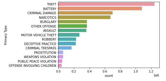 sb.countplot(data=df, y = 'Primary Type',order=top_15.index)