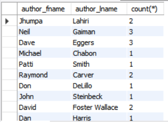select author_fname, author_lname,count(*)