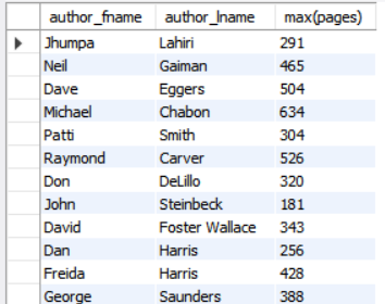 select author_fname, author_lname, max(pages)