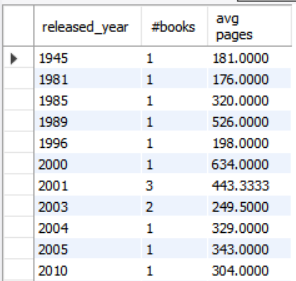 select released_year, count(*) as '#books', avg(pages) as 'avg pages'