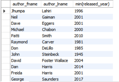 select author_fname, author_lname, min(released_year)