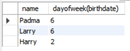 dayofweek함수를 사용하여 요일을 숫자로 나타낼수 있다.