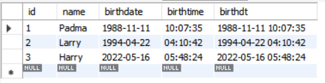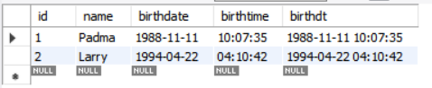 ('Padma','1988-11-11' , '10:07:35' , '1988-11-11 10:07:35'),